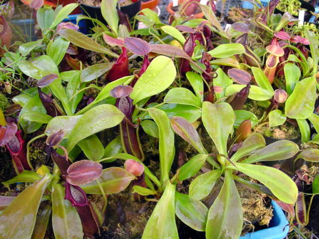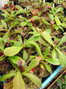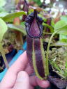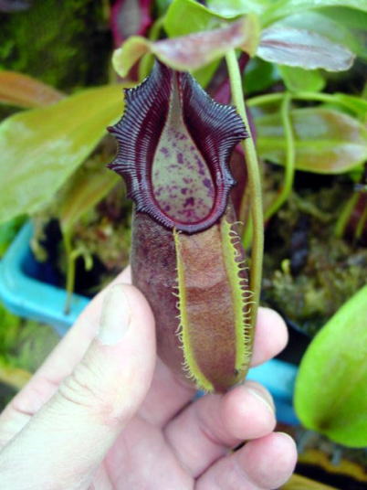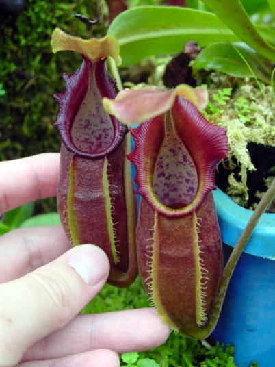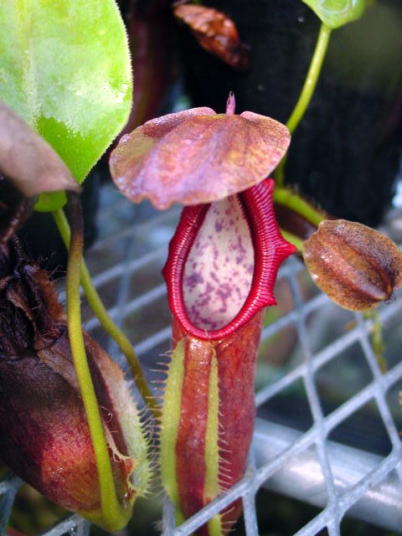 平成9年9月に西スマトラのG.Gadut(グヌン・ガドゥット)に探検旅行に行かれた知人から現地採集の種子を頂きましたすぐさま無菌播種をしていたのですがフラスコから出して馴化したのはごく最近です、実生由来ならではで個体の変異がとても多く目を楽しませてくれます、現地では襟が5cm以上にも広がるタイプや真っ黒な袋もあったそうですこれら実生苗も数年後にはどのように変化してくれるのでしょうとても楽しみです自生地はG.Gadutの山頂1600m付近にしか生育していないそうでやはり暑さには少々弱く夏場の水分管理に神経を使います風通し良くムレないようミズゴケの表面が乾きだしたら潅水するようにして余分な水分があり過ぎないように気をつけます現在はまだ直径20センチ位と小さいですが鉢を一回り大きくする度に大きくなります高山性のネペンテスの中では早い生育でしょう、近縁種にはG.Singalangの山頂(海抜2.800m付近)に自生するN.singalanaがあります葉の様子や袋の襟などからも違いがわかりますが良く似た種類ですまたWistuba氏のリストにあるN.carunculata var