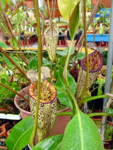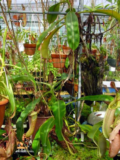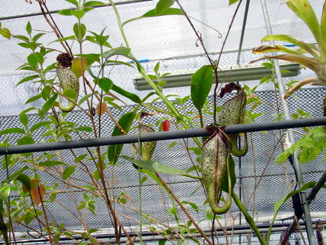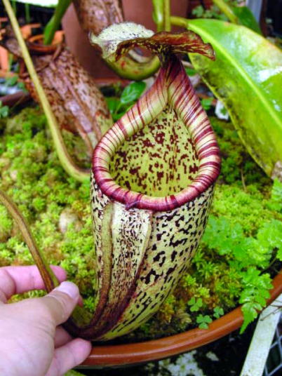 | 栽培方法 | 入手から10年栽培しています、植物体がとても大きくなる種類で株の直径は1メートルは超えます、また根もかなりの量張りますので日向土などで通気良く大きな鉢に植えると安定した生育をします、ミズゴケ植えでも良く生育しますが水分も多めにして管理する為日向土などの砂利系の用土の方が用土が腐敗せず長持ちしますので良いです、この種のように捕虫袋が大きいネペンテスはカエル、ネズミなどの小動物や様々な虫など沢山捕らえます、これだけの大きさの植物体を維持する為には食欲も旺盛です、通常の温室栽培でしたら勝手に捕獲するので餌を与える必要はないですが、人為的に与えるなら熱帯魚用の餌として乾燥コオロギなどがホームセンターなどに販売されていますのでそれらを利用すると良いでしょう、高山性といっても暑さにも強いので低地性のネペンテスと一緒に充分栽培できます。 | ||||||