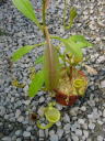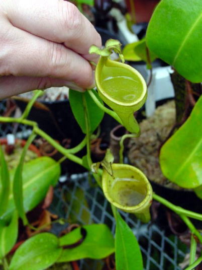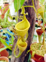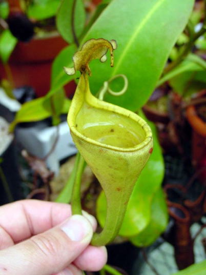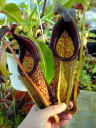この種以前はN.infundibuliformisと一部の人に呼ばれていることもありました主な特徴は上位袋がシャンパングラスのような杯形になることでしょうか近縁種のN.maximaもある程度なりますがN.eymae程にはなりませんまた下位袋はN.maximaと区別がつかないくらいです、またこの種は左写真に掲載しましたが下位袋を全く付けないタイプ(左写真Aタイプ)があります挿し木は比較的簡単でこの10年間に相当数増殖したのですが一度も下位袋を付けたのを見たことがありません植物ホルモンの関係もあるのでしょうか?このAタイプのN.eymaeは葉の感じもN.maximaとは違い少々細長くつるっとした感じになります、BタイプのN.eymaeは下位袋を付けます逆に上位袋を付けさせる為には相当(1.5〜2m)位枝を徒長させないとシャンパングラスのような上位袋を見ることが出来ません、栽培はN.maximaやN.fuscaに準じて管理すれば良いでしょう夏場のムレに気をつけて用土を多湿にしないよう努めます、Bタイプの方は最近海外のネペンテス業者がフラスコ苗を大量に作られていますがAタイプの方は挿し木増殖しかなく栽培が簡単な割に普及が遅れている種類だと思います。 |
