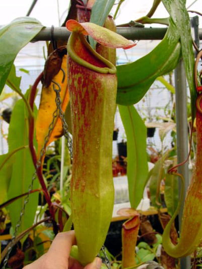 | 栽培方法 | とても丈夫な大型の高山性ネペンテスです、冬期は5℃位でも平気ですし夏場も暑がることないです、通常ネペンテスは肥料に対してとても敏感ですが、この種はネペンテスの中では肥料食いです、IB化成肥料を4ヶ月に1度位9号鉢に5〜10粒与えています、但しミズゴケなどの有機質系の用土の時はロング(360)などを使用しています、こうした大型の生育の早いネペンテスに対してはいくら貧栄養の痩せた土地に自生しているとはいえ、ある程度の置き肥は必要のような気がします、でも間違っても小苗のうちに沢山の肥料を与えないで下さい、ある程度株が大きくなってからです。 | ||||||