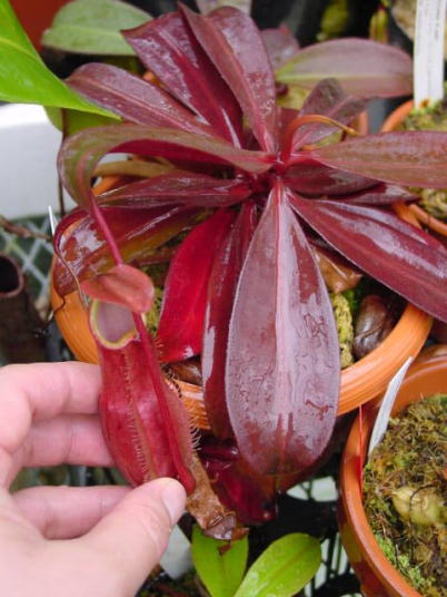 | 栽培方法 | N. longifolia は暑さにも寒さにも強く非常に強健な種類です、しかしながら私の所では栽培を始めて3年になりますが左の写真をご覧頂くと判るようにたいして大きくはなっていません自生地ではかなり巨大になっている写真を見ます、大きくする為には温度(15℃以上)が常に必要なのでしょうか?また日陰を好んで生育しているとも聞きます今一栽培方法を掴めていない種類です、左写真のN. longifoliaはredタイプです植物体全体が本当に赤く綺麗ですがこういった赤い植物は葉緑素が少なく光合成の能力が低い為に生育がスローになるという話を聞いた事があります他にgreenタイプもありますので比較して栽培してみたい所です。 | ||||||