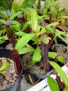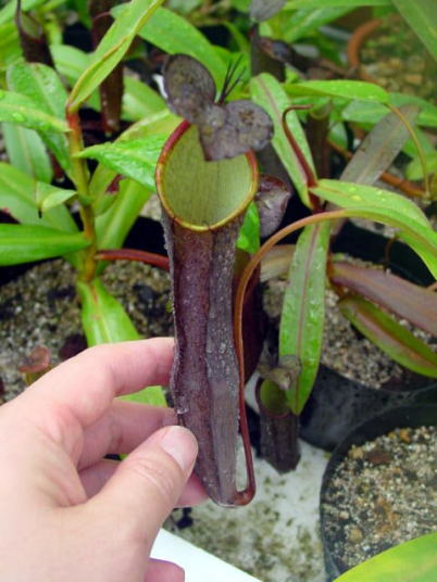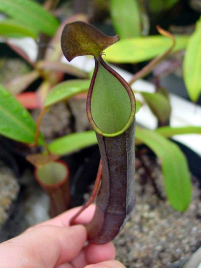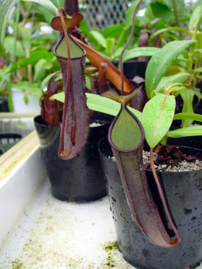 | 栽培方法 | N.ramispinaはN.gracillimaに外観において類似しています、しかしより大きなピッチャーを持っています、この写真のように白い内部と対照的なほとんど黒いピッチャーはネペンテスの中でも数少ない特徴です、栽培は高山性なのでやはり夏場少し暑がります通気を良くしてムレないよう努めます用土は二通り試してみました、ミズゴケと砂+ココチップですミズゴケ植えの場合は古くなってくるとやはり調子が悪くなってきますこの種は特に用土の痛みに敏感なように感じましたので砂などの無機質の用土を使用する事をお勧めします、砂だとミズゴケ植えと違い1.2日で水がなくなる位の腰水にしても大丈夫です。 | ||||||