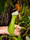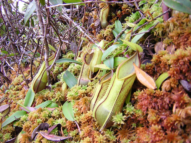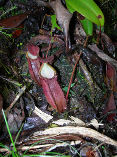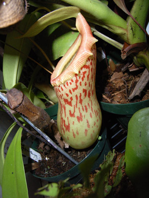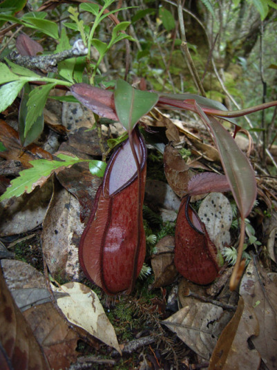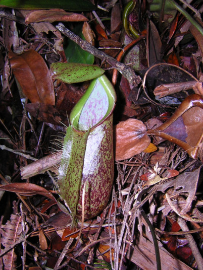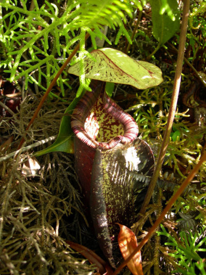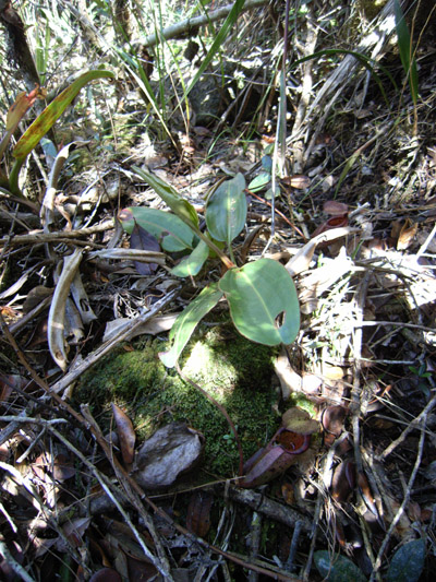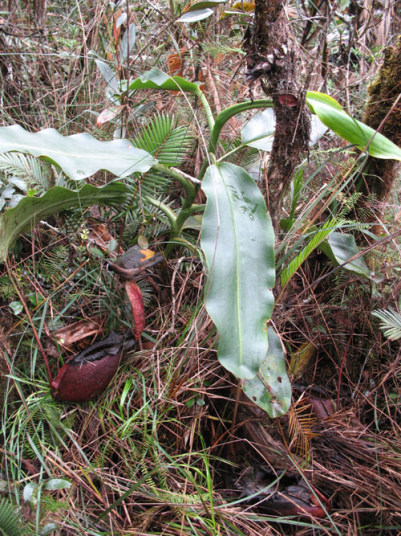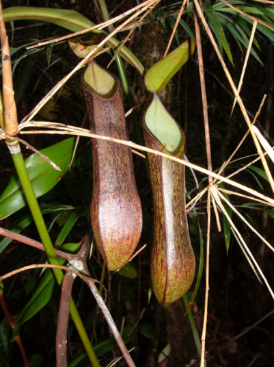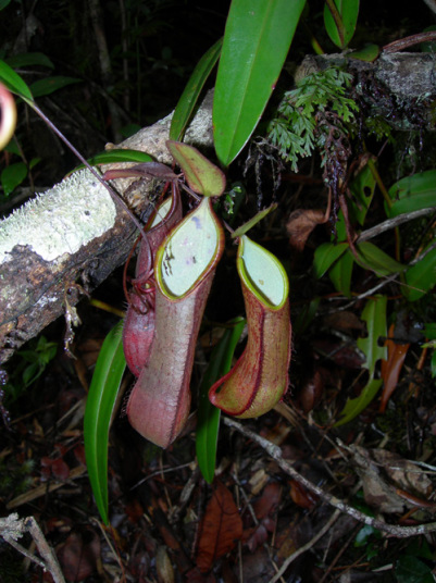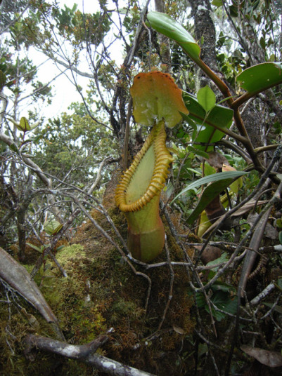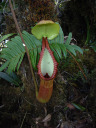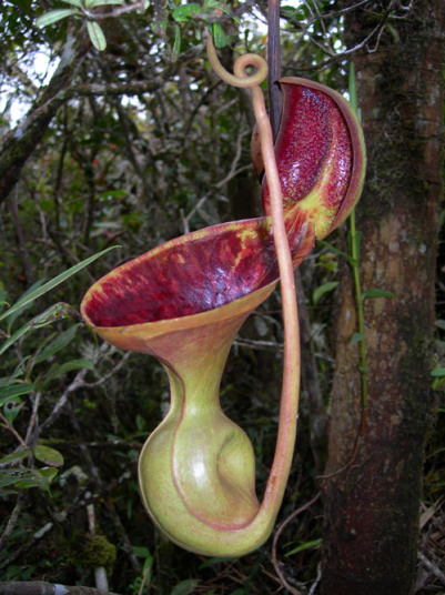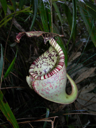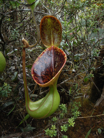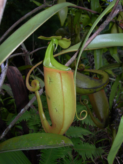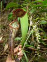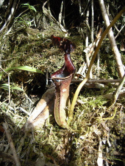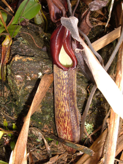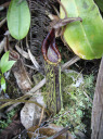 アッパーピッチャーです。栽培下ではほとんど見ることができません。現地では折れた枝が低木に引っかかってそこで生育したりと信じられない環境のようです。 |
