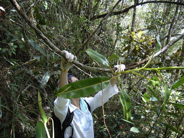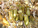 この種も途方もなく大きくなる種類です。面白いのは袋のつるに蜜腺がありその奥の空洞にアリが共生すると言われています。そのアリは消化液の中を自由に泳ぐことが出来落ちた獲物を切り刻み食料にし、また植物は獲物をバラバラにしてもらうことで消化しやすくなるとか? |
