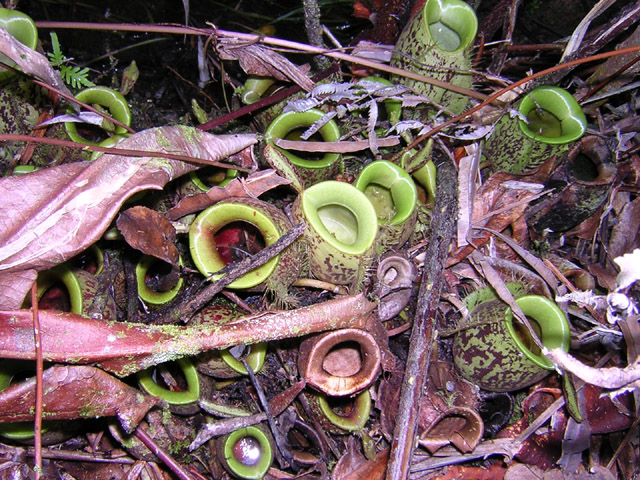 こちらは日当たりの良いところを好んで生育するようです夜間は5℃日中は30℃になるそうです。袋の上部に注目です鳥の糞が落ちています蓋の内側に多量の蜜を分泌しそれを舐めに来た鳥が飛び立つときに糞をして行くそうです。こういった袋を頻繁に見かけるそうですまさにジャングル便器。