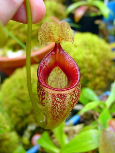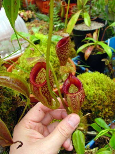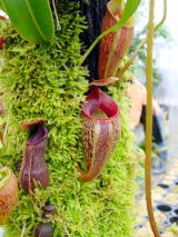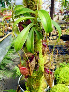 | 栽培方法 | この種は高山性のネペンテスの中でも特に暑さを嫌います、当園では年中無冷房で栽培していますが猛暑の夏はさすがにへばってしまい袋を全て落としてしまいました、小さな株はムレて枯れてしまったのもあります、暑さによる枯れ方はとても急で2.3日前まで元気にしていたかと思うとあっという間に真っ黒になって枯れてしまいます、色々な栽培方法を試しました、その中でも一番上手く行っている例を紹介いたします、左写真の株ですがヘゴ棒を立てて、N.talangensisをハイゴケにて糸を使い巻きつけます、1日にバケツ1杯分の水をヘゴ棒の上の方から垂らし常に僅かですが水が染みて動いています、ヘゴ棒の上方には撹拌扇を回して空気も常に動かしています、今の所調子よく栽培出来ており株元からは多数の新しい腋芽も吹き今後が楽しみです。 | ||||||