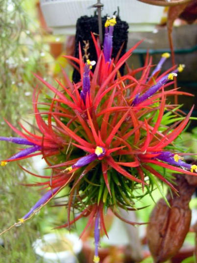 | 当園は主に食虫植物のネペンテスを取り扱っているGreenGrassですがティランジアは温室の至る所にネペンテスと同居しております、この仲間はほとんどが樹上や崖地の岩盤上などで育つ着生植物で、水分や養分の吸収を根に依存していません、その上乾燥にも強いので極端に言えば空気だけで育つという意味合いで「エアープランツ」と呼ばれている種類もあります、現在約600種あまりが確認されその形態の多様さと美しさには魅了されてしまいます。 | |