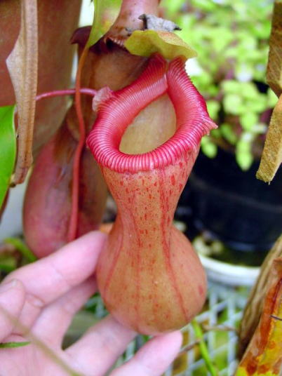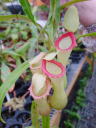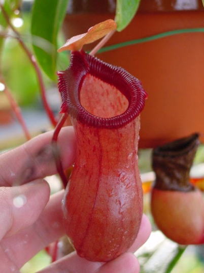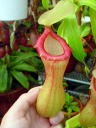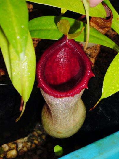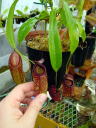 高山性のネペンテスの中でも強健な種類です、夏の暑さを少々嫌いますが風通しさえよくして管理すれば問題なく夏を越せます、葉は肉質で堅く表面はワックスでコーティングされていますので葉からの水分蒸散も防ぐことが出来るので乾燥にも強く野外にて栽培することも出来ます、この種はよどんだ空気、根は停滞した水分を嫌うようですのでミズゴケ植えではミズゴケを乾燥気味に管理するか、また逆に柔らかく植え込んで頻繁に潅水します、砂利系で通気良く植えて毎日散水しても良いでしょう、この種日照不足になると直ぐに袋の付きが悪くなりますので冬期などはなるべく日当たりのよいところで管理するうようにします、冬の寒さにも強く0℃でも枯れませんが生育が止まりますので最低でも10℃位には温度を保って生育させた方がいいでしょう。