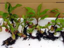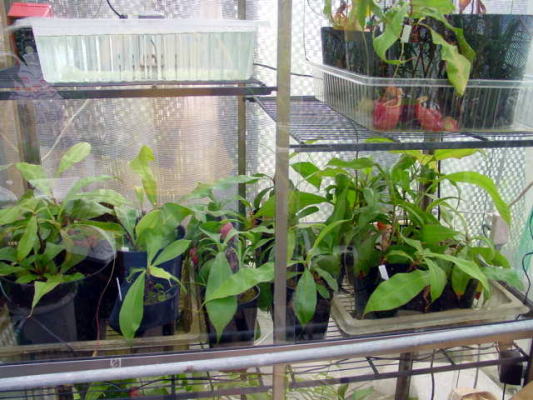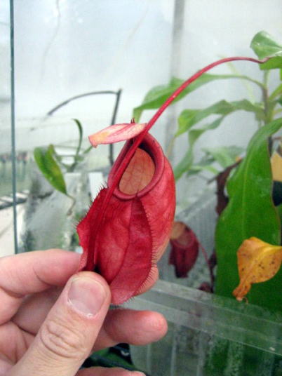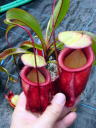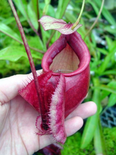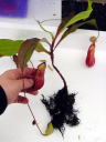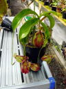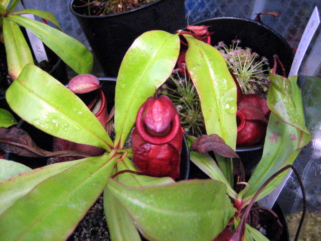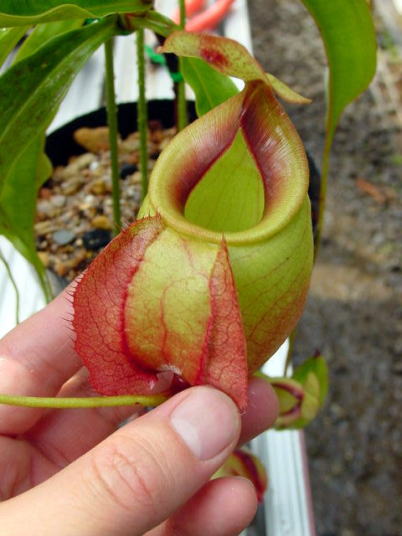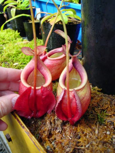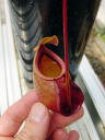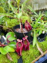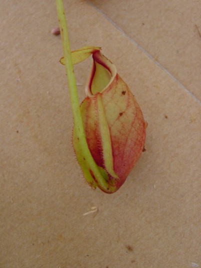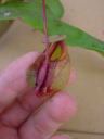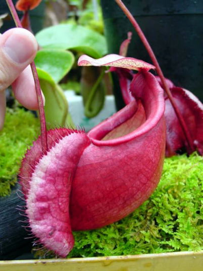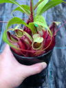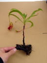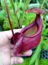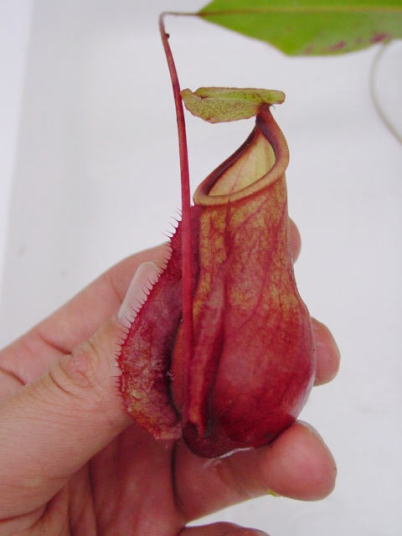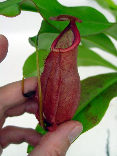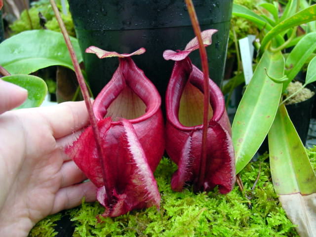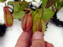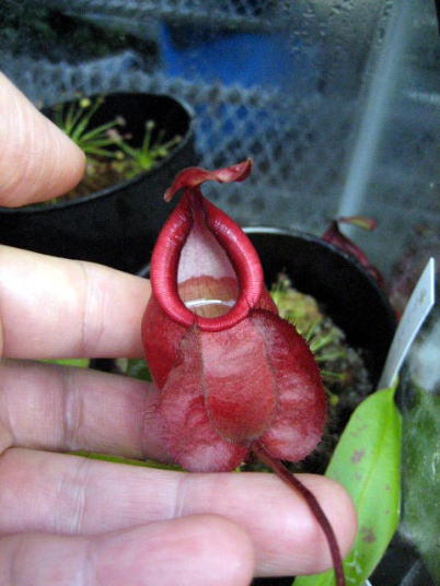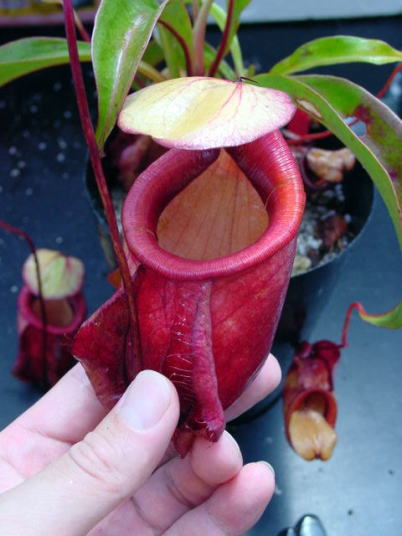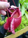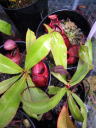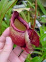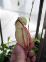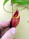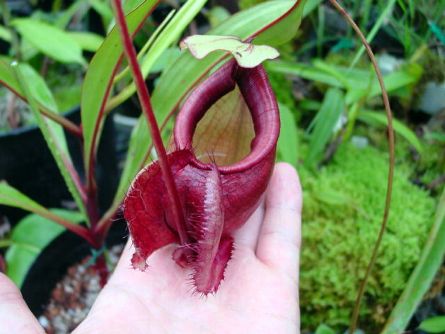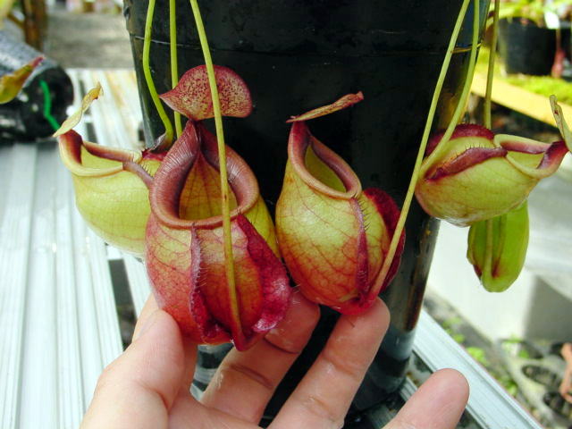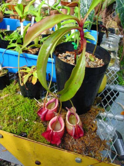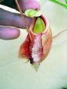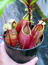 この種は袋の形の変異が多くN.thoreliiやN.mirabilisとの交雑もかなり多いと思われますその中でも丸い袋が観賞価値が高く多くの趣味家から好まれています、また袋の持ちも良く上手く作ると20〜30個の袋を鈴なりに付けとても見ごたえの良い株に出来ます現地の方に教わった栽培のコツは腰水にして直射日光下で栽培し袋はその腰水に座らせると良く着袋するそうです、その出来かけの袋は日光には当たらないよう鉢と鉢の間に隠れるように置くと良いそうです、自生地ではブッシュなど背の低い草の中に袋があるイメージでしょうか、葉には強烈な日光を当てて袋には当てずがコツのようです。 |