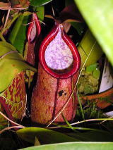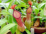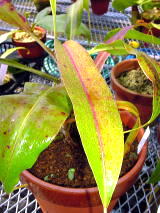 (素焼き鉢):色々な種類がありますが透水性があり鉢の表面から水分が気化し、鉢内の温度を下げる効果があります。このような鉢は鉢内が蒸れにくく、根腐れを起こしにくいものです。ネペンテスは通気を好むので好都合ですが、鉢内が非常に乾きやすくうっかりするとからからに干からびてしまいます。また水の中に含まれる塩類などが鉢に蓄積しやすく、長期間の使用は避けた方が良いでしょう。