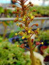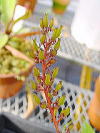 ネペンテスは雌雄異株で、またある程度株が老熟してこないと開花しませんし、開花時期にもバラつきがあります。雌花が咲いたら花粉が付けれるように、雄株が咲いたときには花粉を薬包紙などに種名、採取年月日を記入して小分けして冷凍庫に保存しておきましょう。花粉の寿命は定かではありませんが数年は使用できるようです。交配のタイミングは雌花が咲いて何日かするとがく片から多量の蜜が出て異臭を放ちますので、この頃をみはからって花粉を付けます。交配後1日は水をかけないようにします。あとはラベルに交配年月日と交配した種名(♀x♂)を記入します。うまく受精すると4〜5ヶ月位で種子ができますので刮ハが割れて種子が飛び散る前に開いて採種しましょう。特に無菌播種をする場合などは刮ハが割れる前に採種することで後の殺菌が楽になります。