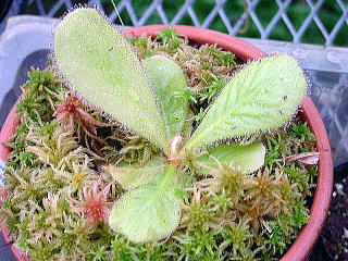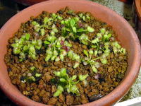 Cephalotus follicularisの葉挿し オーストラリア南西部のごく狭い地域にのみ生息する1属1種の珍しい食虫植物。ネペンテスのような捕虫嚢を持っています。袋の大きさは自生地では最大で10cm位にもなりますが栽培下では5〜6cmでしょう。この種類も高い湿度を好むので、フレームや水槽の中で密閉して栽培すると良いです、低温にも結構強く、広島では野外でも栽培可能ですが最低5℃位に加温した方が成育は良いでしょう、夏場の暑さには弱いようです、株分けで増殖するのが簡単ですが葉挿しや根伏せでも増殖できます、時期的にはこの種類の成育環境を作り易い秋から春に行うと成功率が高いようです。 |