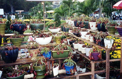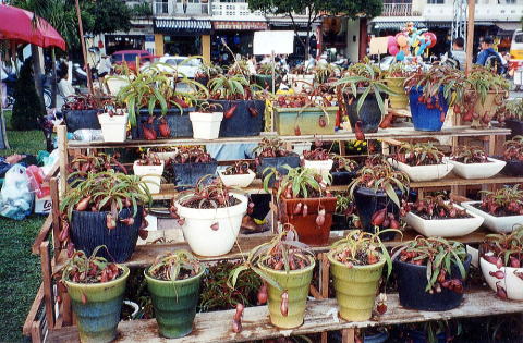 | 私の知人がこの度ベトナムへ旅行した際にホーチミン市街のとある屋台にて鉢植えのN.thoreliiが大量に売られていたので写真を撮ってきてくれました。 日本円にして約¥1500位の価格だったそうですが大きく綺麗な化粧鉢に植えられて丸々した袋を沢山付けたN.thoreliiはさすが原産国だけあって上出来です、当地でこの価格は高級品になるそうです。 |